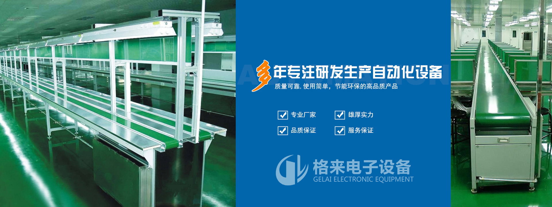 中山市格來電子設備制造有限公司專業研發生產自動化設備,主要產品有:鏈板線系列、流水線系列、倍速鏈生產線系列、 家電輸送裝配線、滾筒生產線系列、波峰焊系列、LED老化線設備等